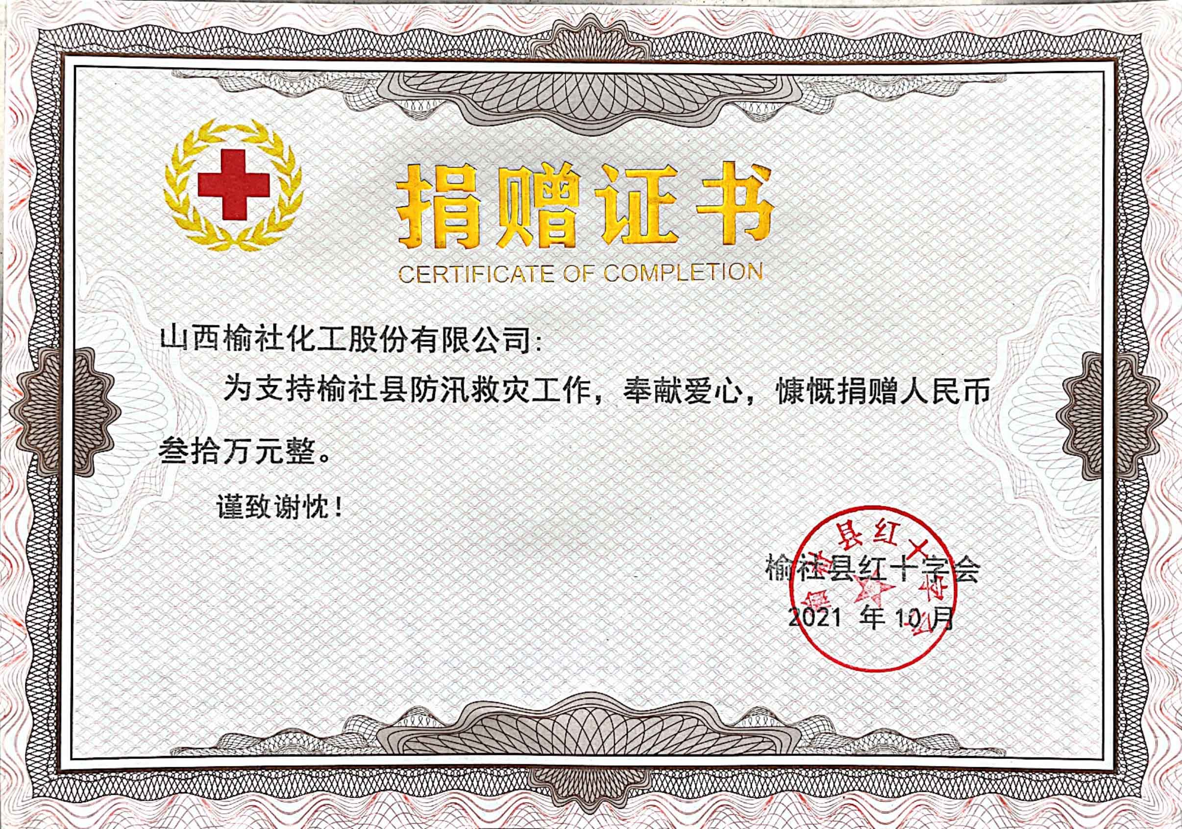 2021年榆社县防汛救灾捐赠证书