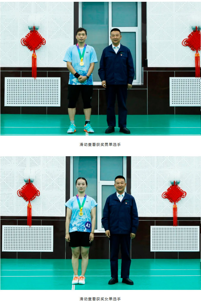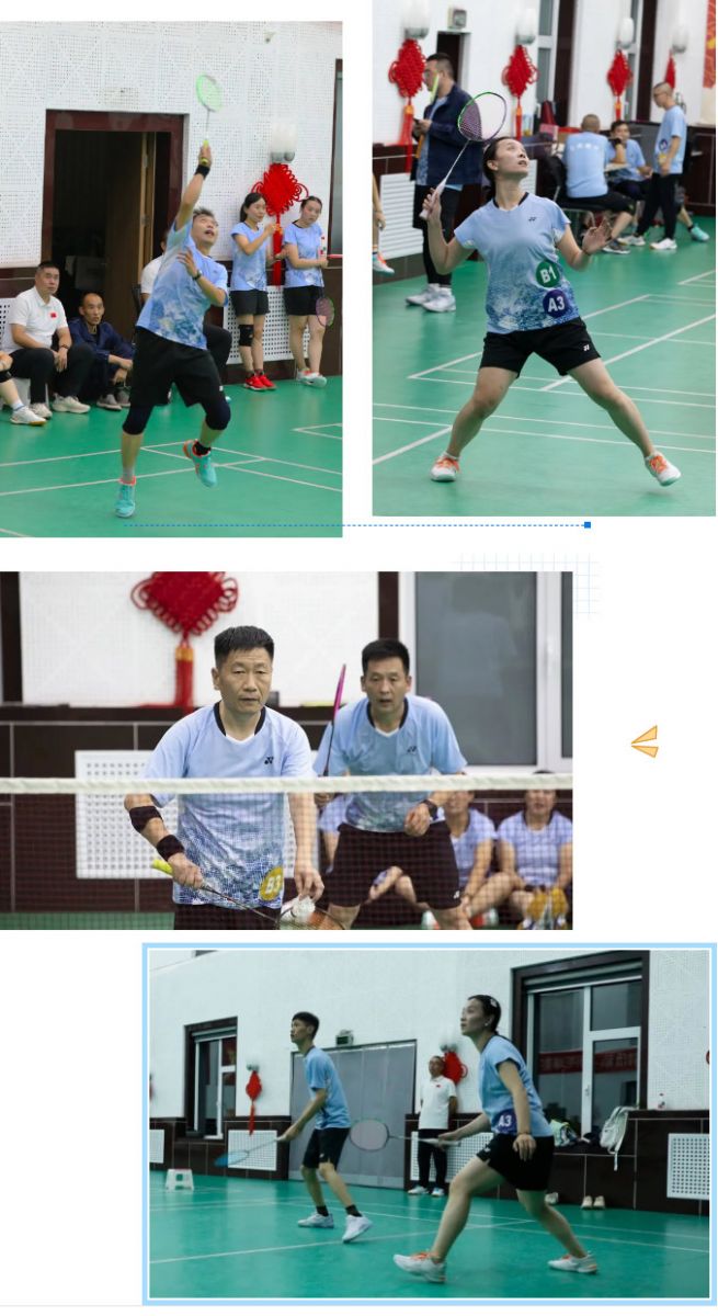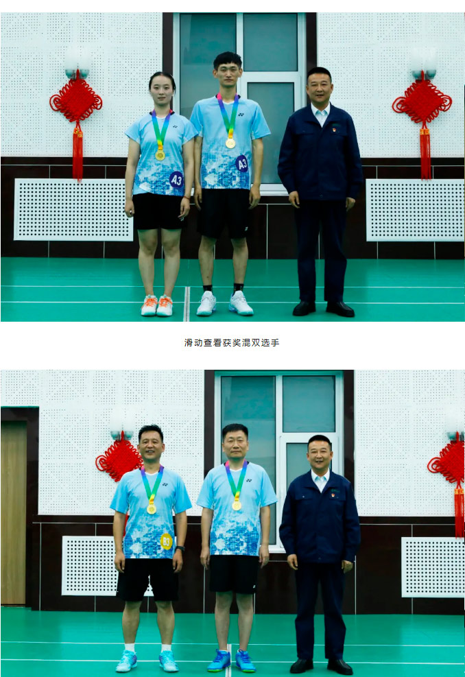 在羽毛球比赛中,经过多轮比拼,各组别名次最终揭晓:男子单打:冠军(李德飞),亚军(连鹏),季军(冯宇辉、连立欣)。女子单打:冠军(裴芷汀),亚军(常艳萍),季军(王凡、刘娇)。混合双打:冠军(任泽凯/裴芷汀),亚军(赵瑞/常艳萍),季军(张家兴 / 刘娇、郝勇/王利)。男子双打:冠军(汗水浸湿了衣衫,却浇不灭大家的拼搏热情;比分交替上升,更激发了选手们的斗志,用一次次精彩的攻防对决,赢得现场观众和候场选手的阵阵掌声。