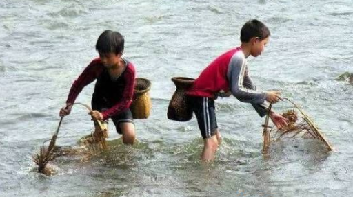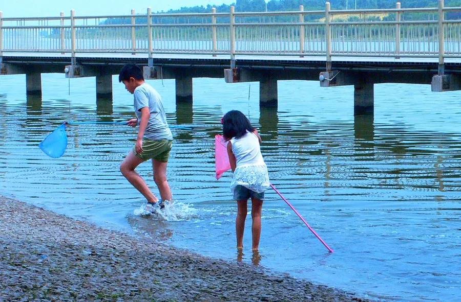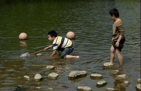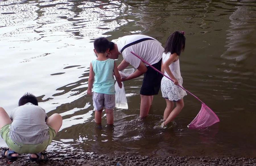 尽管如此,孩子们依然兴奋不已,因为现在生活在城市里的小朋友,他们的童年总是少几分自然风光,小朋友深深地喜欢着蓝天白云小河流水,而这样的风光却似乎不及我的童年那般司空见惯,那时候没有渔网,衣服是最(好)的围捕工具,傍着石头我们把衣服围成半圆,边上留个小口,小鱼儿一条两条……钻进来,我们也悄悄地收了口,然后捉鱼、数鱼、再捕、再数,直到夜幕降临,我们才恋恋不舍地把这些鱼儿放回水中,穿着湿了的衣服回家!