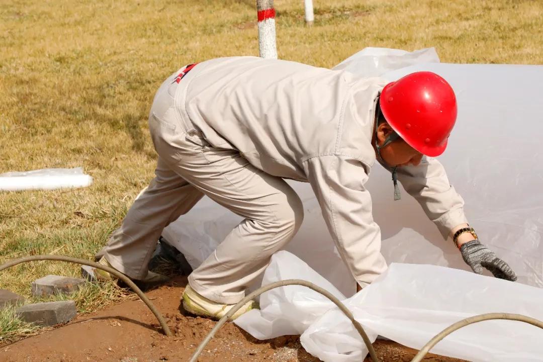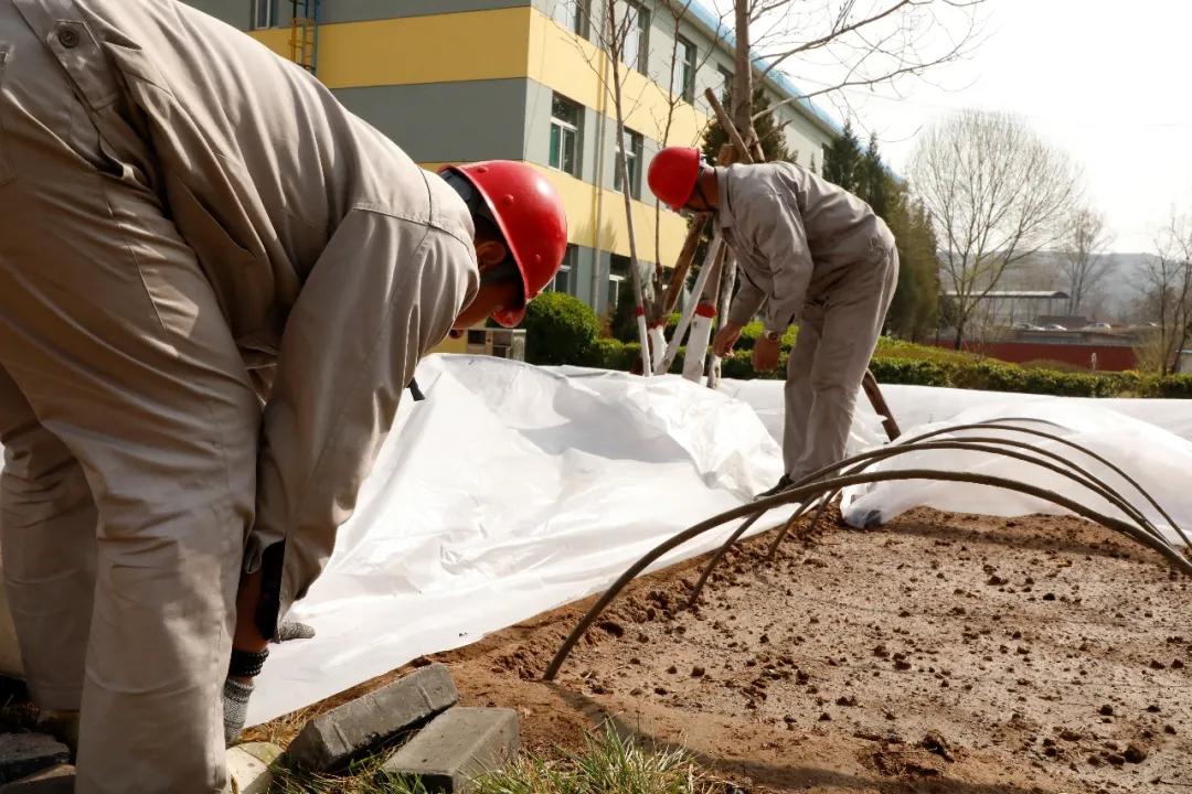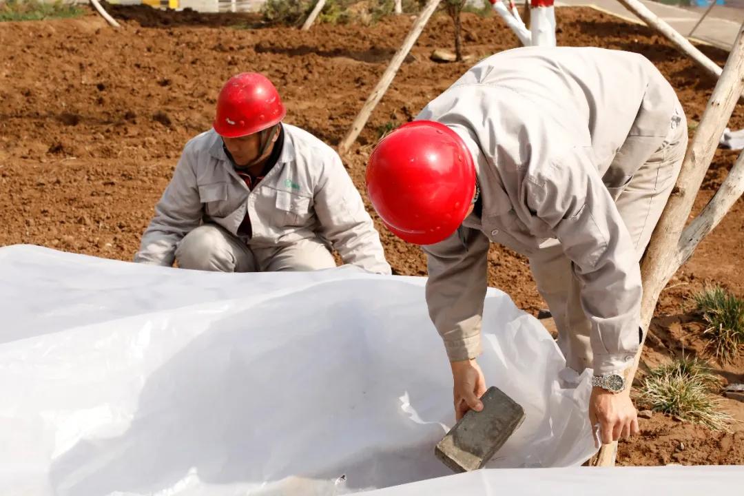 绿化带内工人师傅们默契配合,撒种、扶苗、培土,一气呵成,并利用塑料薄膜支起了一座座“小拱棚”,尽管泥土沾身,但从他们脸上看到的是对未来的美好憧憬。