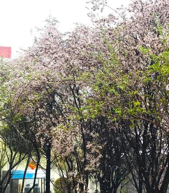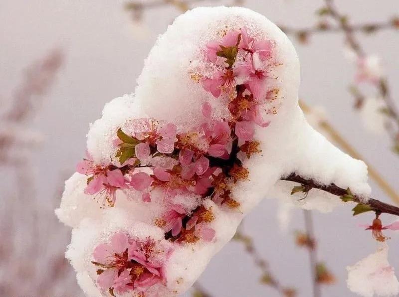 抬头望向远处,那刚开不久的桃花树上也落满了洁白的雪花,雪花把整个桃树都包裹了起来,就起名叫“雪树”吧。套用卢梅坡的《雪梅》,也许可以说“桃须逊雪三分白,雪却输桃一段香”。在春天这个百花园里,各种花都在竞相展示自己的艳丽,也许雪花也想来凑热闹呢!