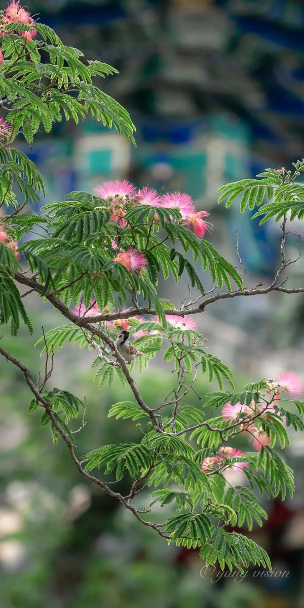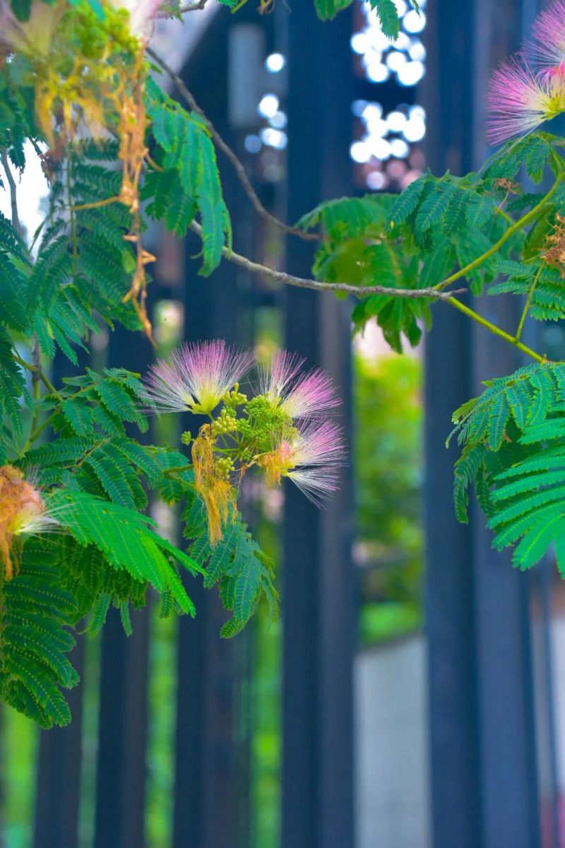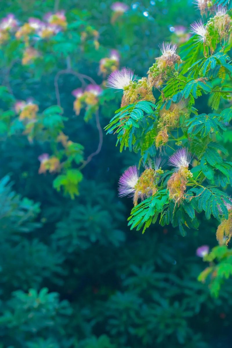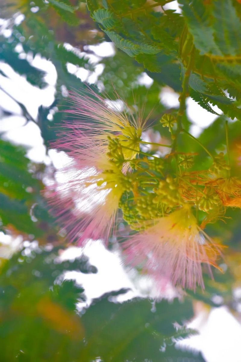 合欢树也叫夜合欢、绒花树。它的叶子两两相对,晚上则会合抱一起;它的花瓣就像蒲公英,丝丝缕缕聚集而来。绽放时就像孔雀开屏,尽情地展开;凋零时花瓣全部闭合呈现成一把扇子状,趁风而归,飘落到想去的地方。