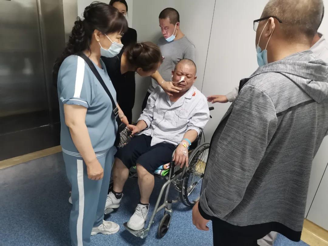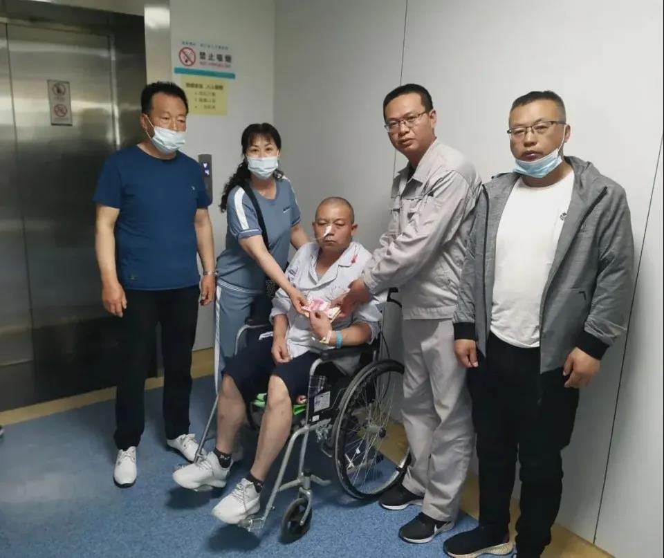 在医院,我们见到了刚做完康复训练的梁永军,脸色苍白的他,鼻孔里插着胃管,左手上密密麻麻的血管已被贴满了白色胶布,两眼发呆静静地坐在轮椅上。当我们慢慢靠近他时,他便不由自住的留下了眼泪,病痛让他无法言语。领导们向亲属了解了他最近的病情状况、医疗费用等问题,并亲手将“榆化爱心基金会”的一万元爱心及时救助金送到他的手中。临行前嘱咐他“安心养病,听医生安排,坚持锻炼,及早康复,早日回归岗位。”不会说话的他,只能用眼神传递着他的情感,不停的点头,似有话说却只能蹦出个“咿咿呀呀”。他的家人们表示非常感谢公司的关心,为这个不堪重负的家庭雪中送炭。