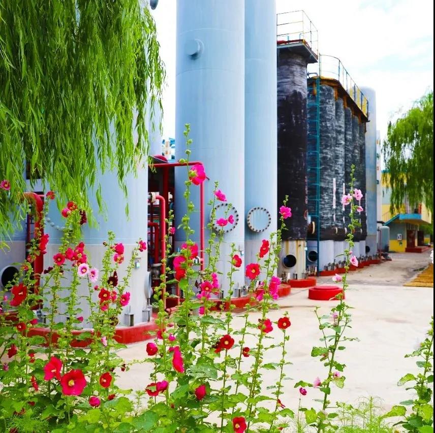 歌曲《声声慢》中描绘的美景“青砖伴瓦漆,白马踏新泥,山花蕉叶暮色丛染红巾”与盛夏中的树脂二厂所呈现出来的美景有异曲同工之妙。试想,走在小雨打湿的青砖铺就的厂区道路上,红白相间的路沿石显得格外亮眼,看着道路两旁造型新颖的各式景致和精美的盆栽,厂区绿化带内的树木郁郁葱葱、各色鲜花点缀在其中,一阵清风吹过,花瓣轻沾衣襟、花香扑面而来,此时的你又怎能不慢下脚步,去用心感受一下这如诗如画的美好画卷呢?