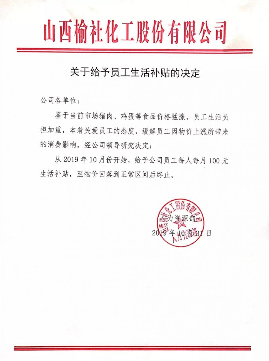 继刚刚结束的三个月高温补贴后,公司决定从10月起,给全体员工每人每月增加100元生活补贴。