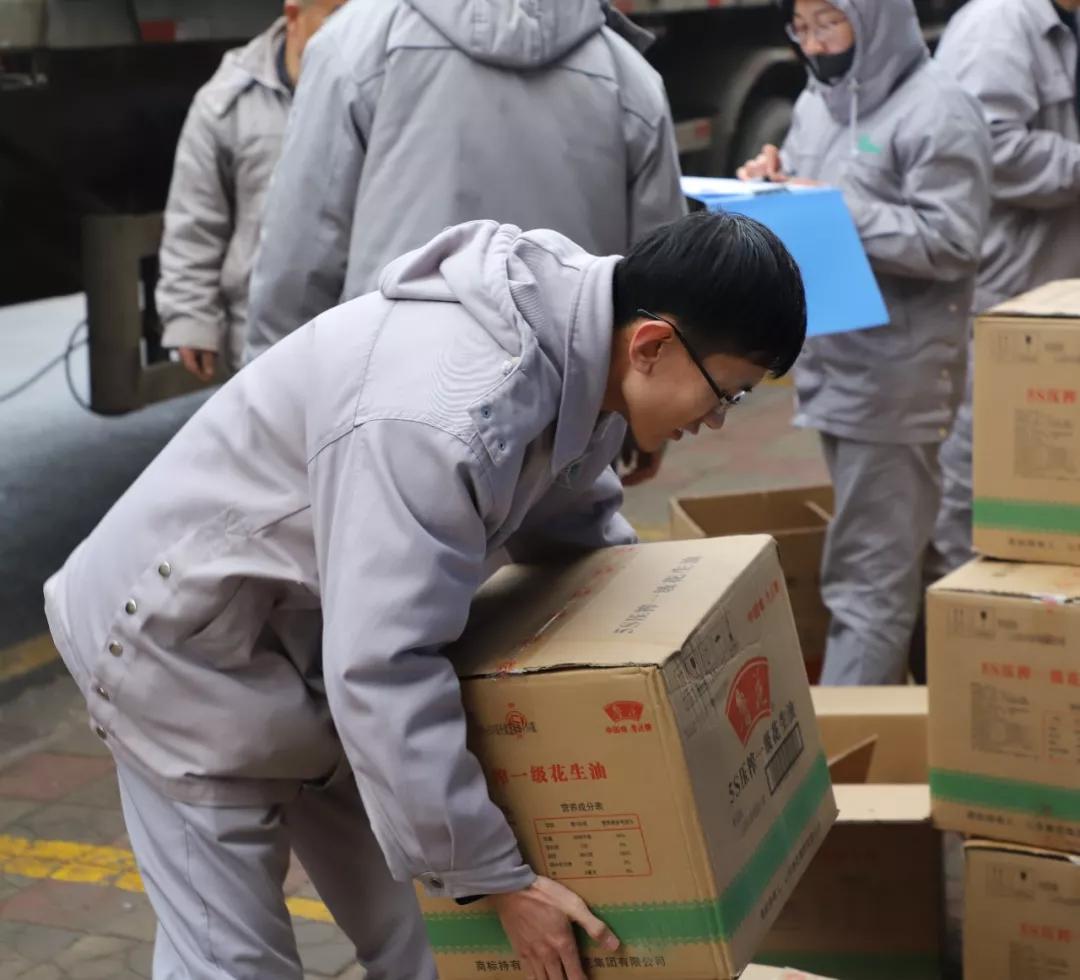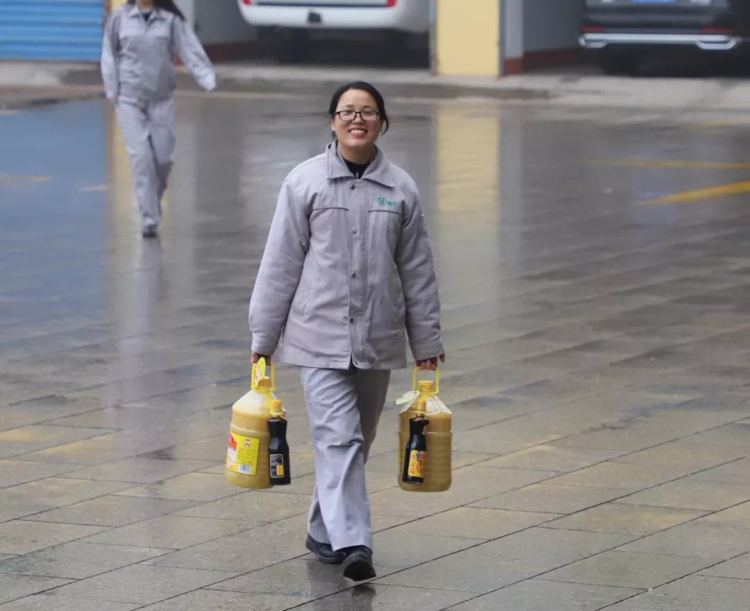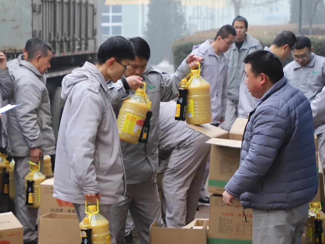 天气虽然寒冷,但是福利分发现场热火朝天,各部门人员配合默契,井然有序,一桶桶承载着公司关爱的食用油传递到员工手中。