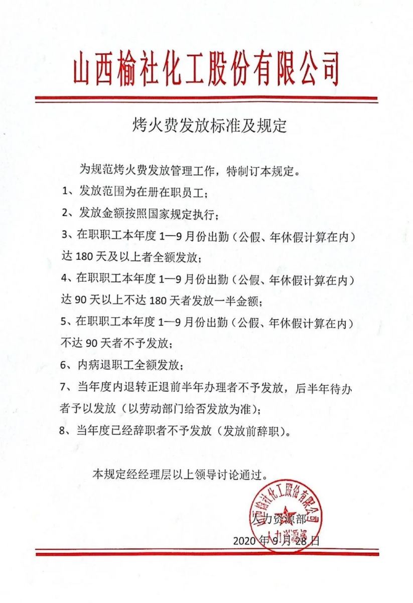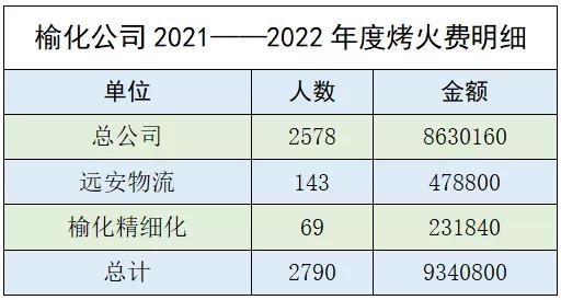 本次烤火费发放涵盖总公司、远安物流、榆化精细化全体在册在职员工共计2790人,按照国家3360元的标准执行,结合公司2020年出台的烤火费发放标准,共计发放总金额934.08万元。