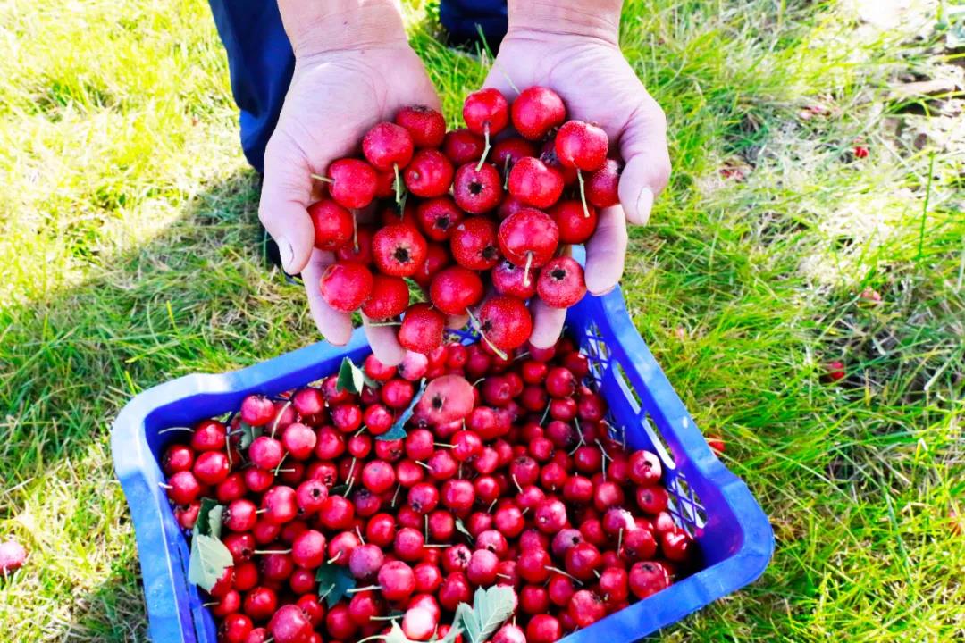 进入“采摘园”,“漫山遍野”的山楂树上挂满了一颗颗火红的山楂,玲珑剔透甚是可爱。员工们争先恐后走进这“山楂园”,欢聚在美丽的山楂树下,纷纷去枝头采摘,偶尔摘下一颗品尝,甜中带酸,山楂特有的味道瞬间充斥整个口腔。大家说说笑笑,采摘的同时不忘相互分享,合影留念,记录下这令人难忘的时光。三个一群,两个一伙,各尽其能,各显神通,开始采摘一个个诱人的果实,拿着事先准备好的收纳筐,边摘边品尝……整个“山楂园”欢声与笑语不断,快乐与热情四溢。