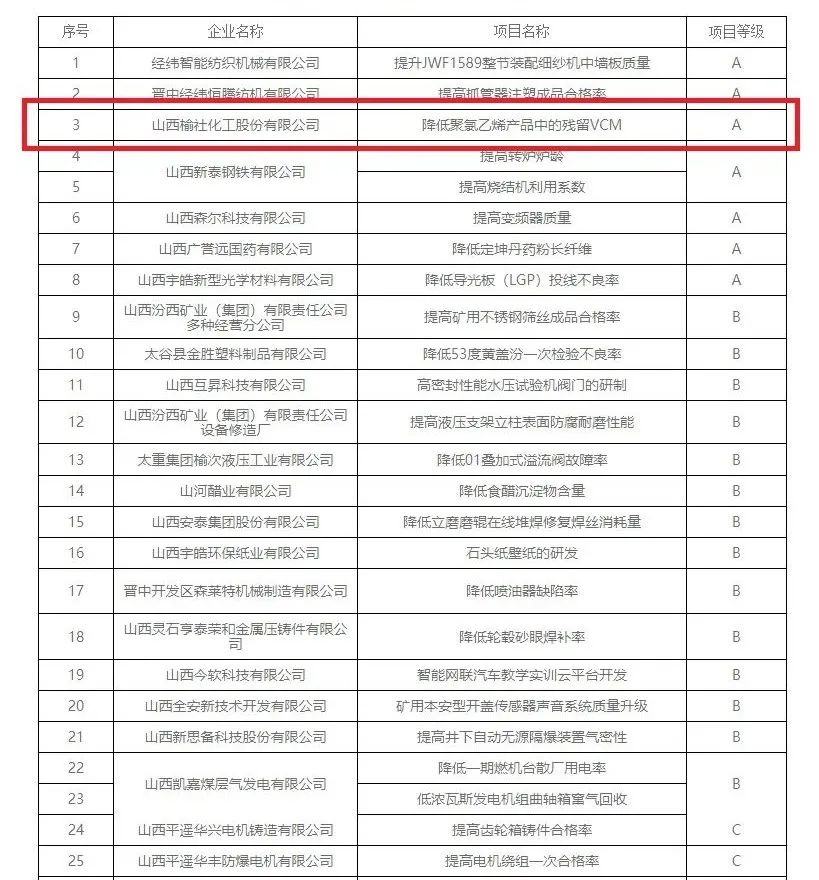 近日,2021年度晋中市质量攻关项目名单揭晓。公司“降低聚氯乙烯产品中的残留VCM”质量攻关项目获得A类优异成绩。
