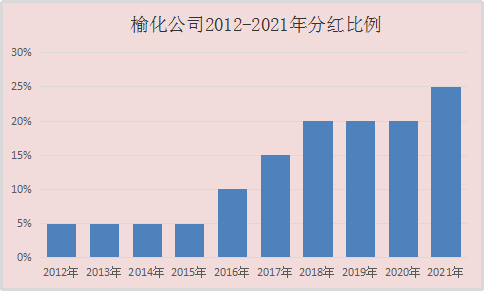 以刘俊董事长为核心的公司领导班子自上任之日起,便确立了“把员工利益、股东利益、企业发展放在心上”的核心思想,作为开展各项工作的根本宗旨。在疫情影响的严峻形势下,全力以赴保持企业健康高效发展,集中精力提高员工工资福利待遇,展现了榆化的全新风貌。同时,公司更是始终不忘为发展奠基铺路的各位股东,坚定不移将股东利益放在心上,在保证所有者权益稳步增长的基础上,不断提高股东分红,让股东共享企业发展的成果。分红比例从2016年的10%,增长到2021年的25%,2017年—2021年,五年分红达到了100%。