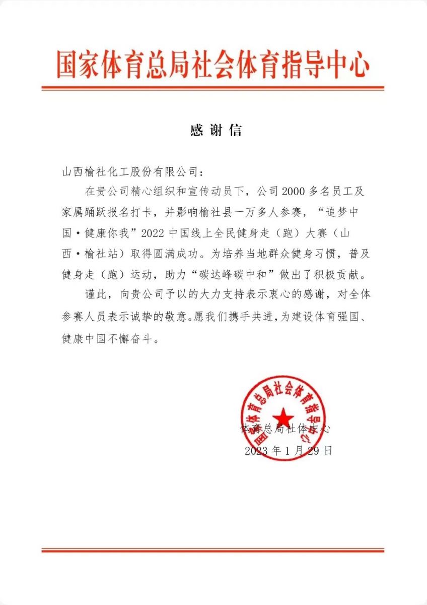 这封带着温度的感谢信,是对健康榆化建设的肯定,也是对榆化人健康生活的点赞。近年来,公司积极响应国家全民健身号召,修缮职工篮球场、羽毛球场地,新建职工健身馆等,为员工提供良好的运动健身条件;举办篮球赛、拔河赛等赛事,组织榆化拔河队参加省、市、县拔河争霸赛,并取得优异成绩;开展全员体能测试、越野达标、健身达标等活动,促进员工关注体重指数、血压、心率等身体指标,引导员工培养健康的生活方式,为好博(中国)注入健康、文明、自律的新内涵。健康榆化为榆化人的幸福“加码”。
