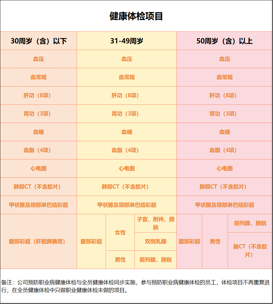 50周岁及以上员工,每年体检1次;31-49周岁员工,每两年体检1次;30周岁及以下员工,每三年体检1次。