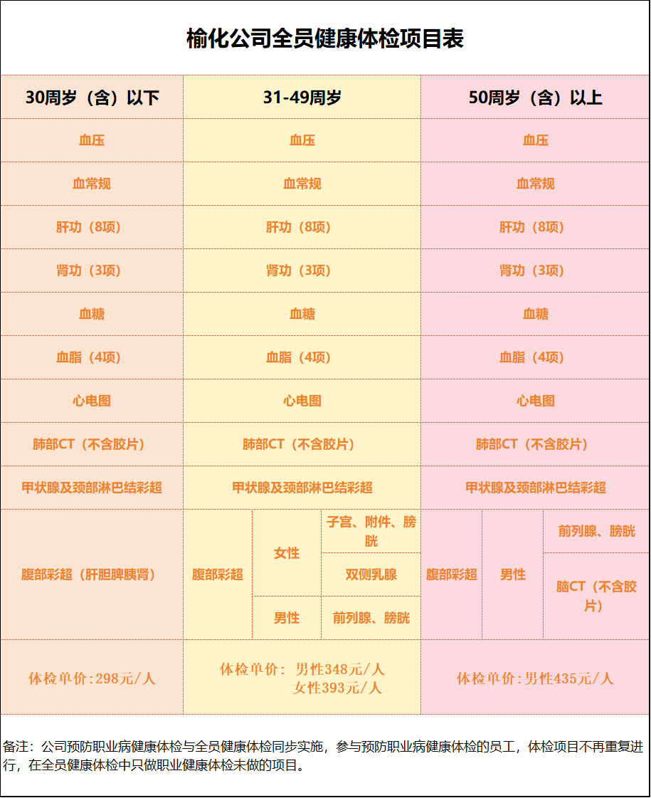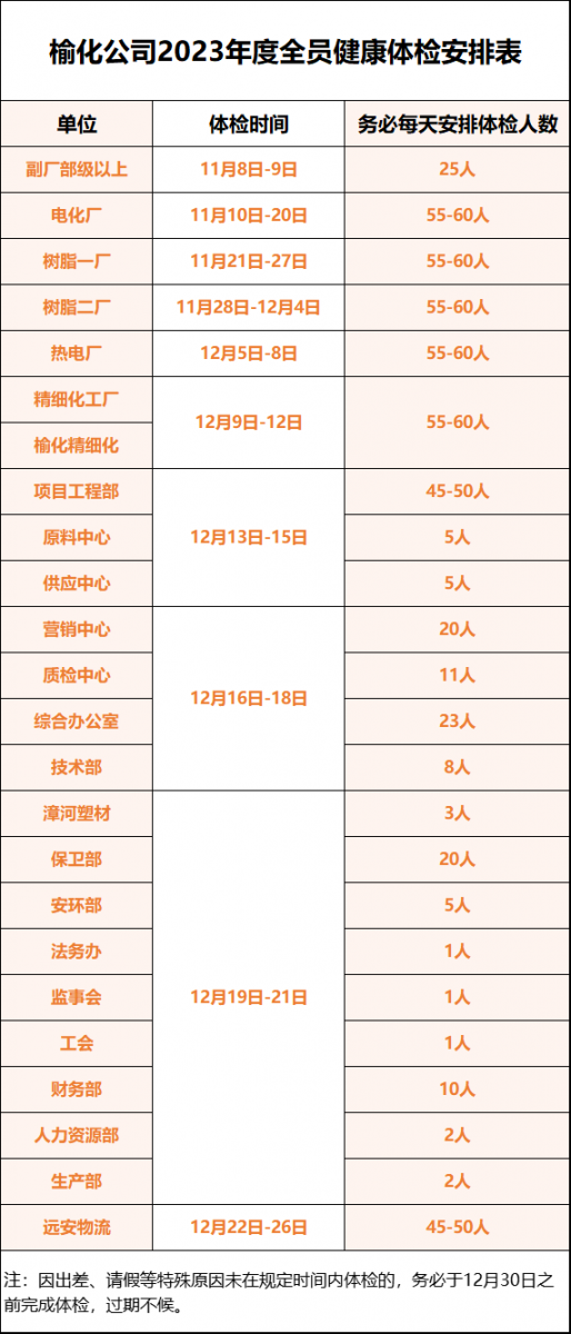 根据《榆化公司全员健康体检实施方案(试行)》的文件精神,公司定于11月8日起组织开展全员健康体检。具体事宜安排如下: