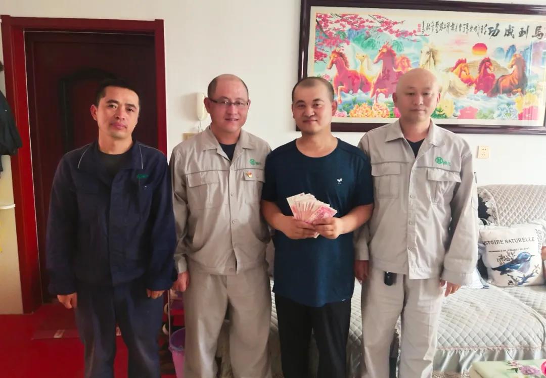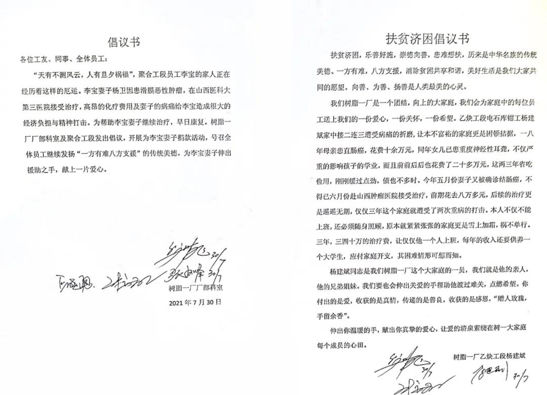 在得知情况后,树脂一厂领导高度重视,第一时间研究决定,向全体员工发出“爱心捐款倡议书”,立即得到了全体干部员工的响应。大家慷慨解囊,纷纷向杨建斌之妻和李宝之妻伸出援助之手。短短几天的募捐,共募捐到19565元赠予杨建斌、18325元赠予李宝(前期水滴筹员工自发募捐5030元)。