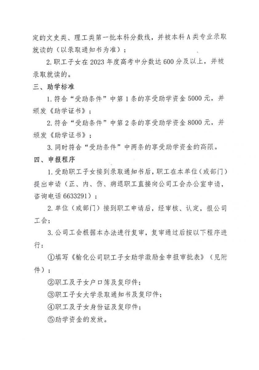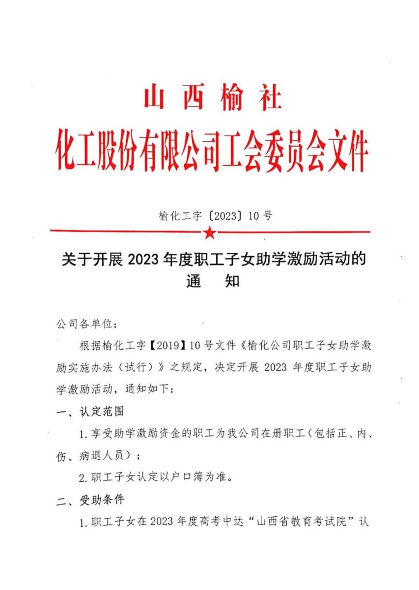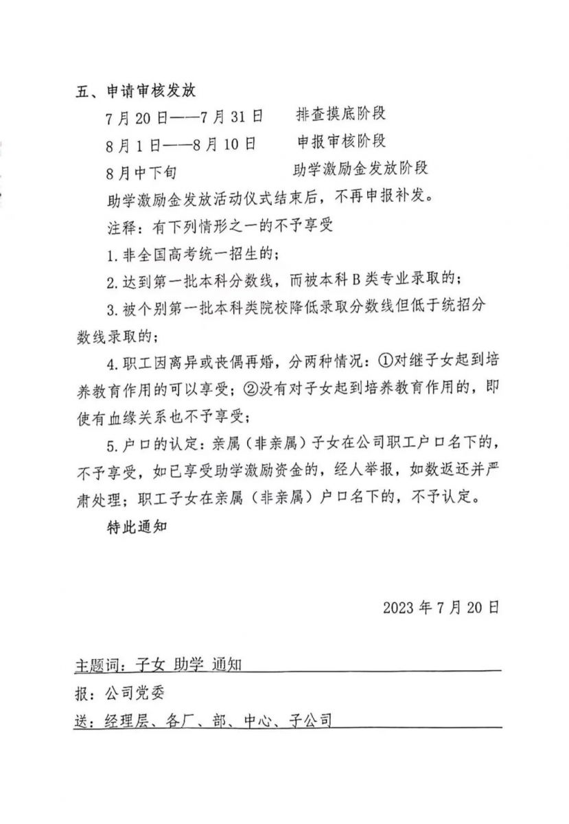 7月20日,随着各高校录取通知书陆续发放,公司下发了《关于开展2023年度职工子女助学激励活动的通知》,对职工子女助学激励的认定范围、受助条件、资助标准、申报程序等进行了详细说明,2023年度职工子女助学激励活动正式开始。