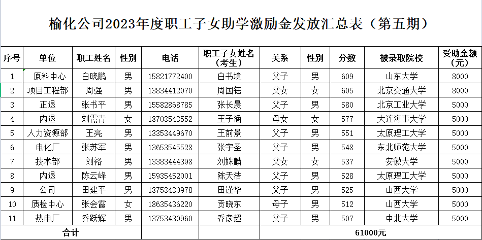 自7月20日助学激励活动通知下发以来,经过各单位、各基层广泛宣传分阶段性有序推进,通过前期摸底、申报、审核,本年度符合受助条件的共有11名高考成绩优异职工子女,共计发放助学激励金61000元。