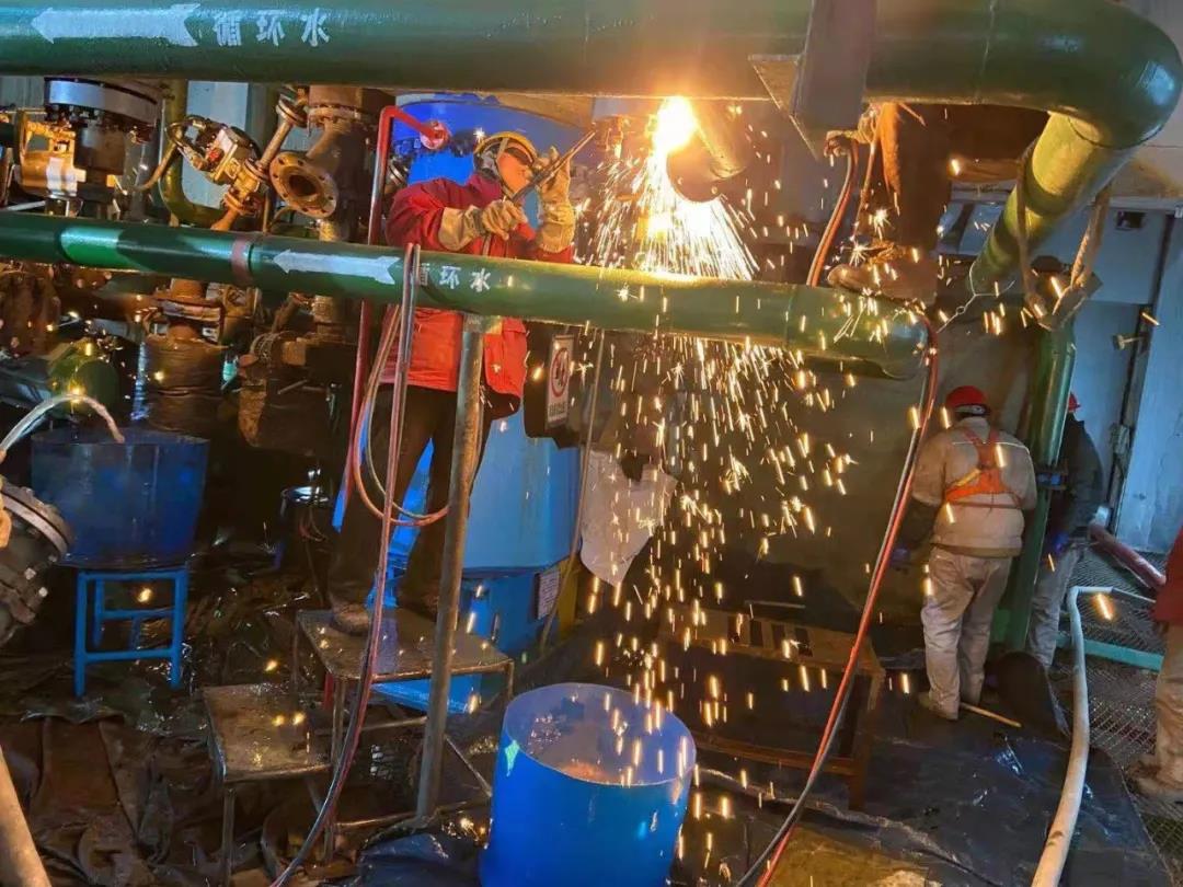 第二天早上5点多钟,星月犹明,寒意正盛,树脂二厂聚合楼前所有参与更换聚合釜内冷管的干部员工已全部到齐,开始了更换前的筹备工作,出料、置换、分析合格、现场安全措施确认等一系列准备工作后,天微微亮,任厂长再次对所有参与此次作业人员进行了安排部署,着重强调了所有工作必须在保证安全的前提下进行,最后不失风趣的说道:“同志们,加班饭管够吃,加班钱管够挣,咱们一定要安全顺利的完成此次任务!”随着一声令下,几十号人全部投入了紧张的工作之中,吊车、电焊、扳手、倒链、软梯等轮流上场,现场作业紧张却有序的进行着,干部全程盯守,钳工一个个奋力拧螺丝的表情、焊工一个个专注的神情、现场干部一双双锐利的眼睛、对讲机里一遍遍的问答,此时此刻,所有的人心都凝聚在一起。