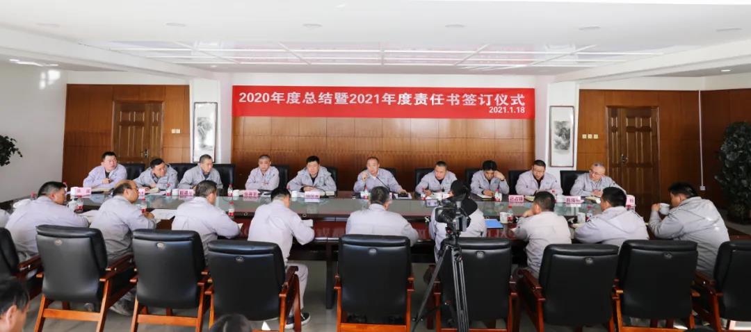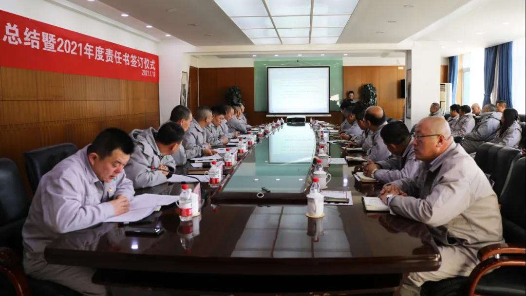 1月18日,公司在三楼会议室召开2020年度总结及2021年度责任书签订仪式,公司党委、董事会、监事会、经理层,各厂、部、中心、子公司负责人参加会议。根据疫情防控要求,公司对2020年度总结表彰大会进行了调整,将先进集体、先进个人的表彰与2021年度“五一”劳动模范表彰合并延后举行,缩小范围召开2020年度总结会。会议由公司副董事长、财务总监杨柳青主持。