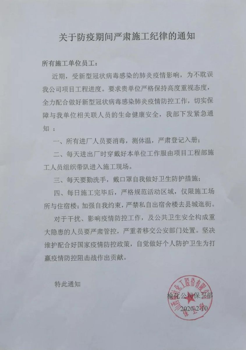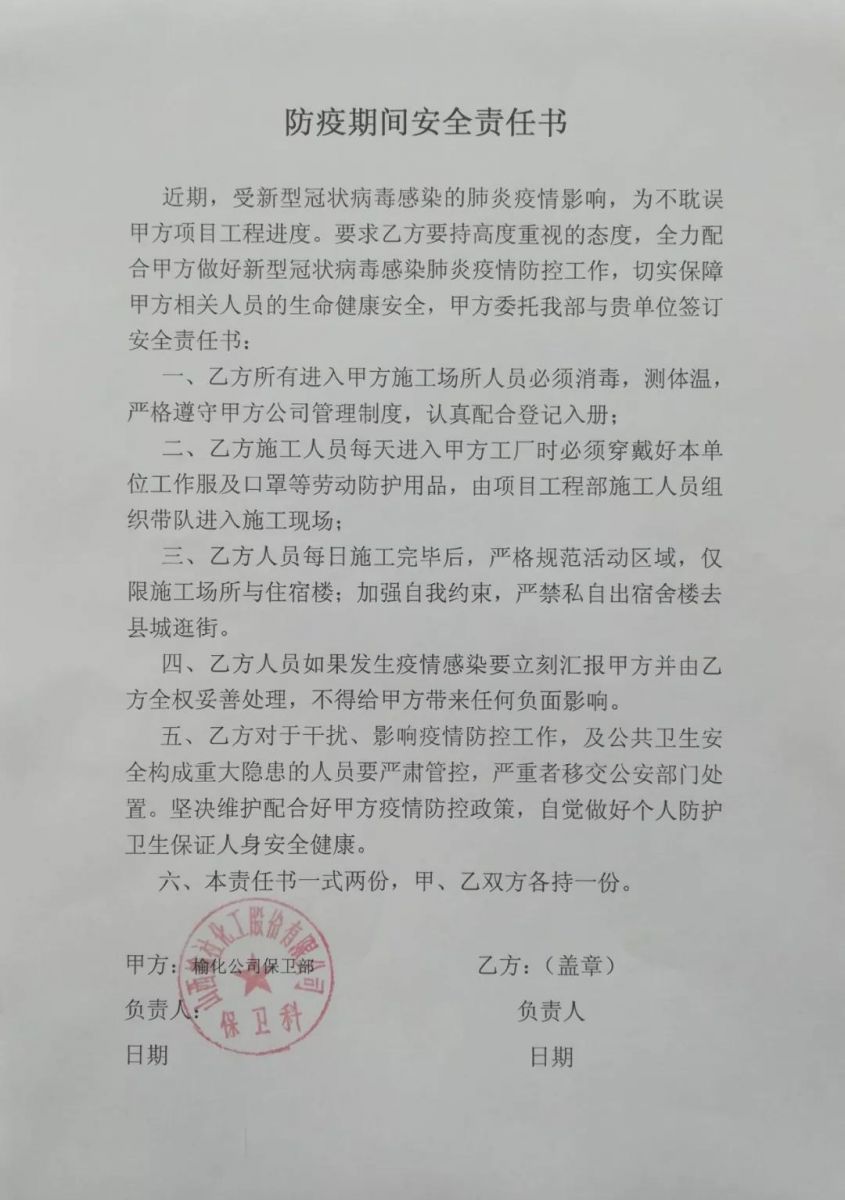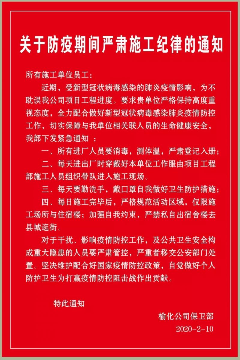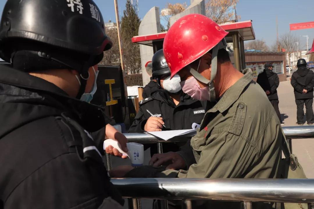 严格管控进入厂区外来施工人员,最大限度减少人员流动;我公司项目建设逐步按计划推进,给公司防疫工作带来难度,保卫部迅速向施工单位下发紧急通知,并逐一给施工单位宣讲防疫期的工作要求,认真与施工单位负责人签定安全责任书;同时在施工单位住宿区大门外设置管理关卡,专人值守,对外来人员实行管制,进出时必须消毒测体温,登记备案。