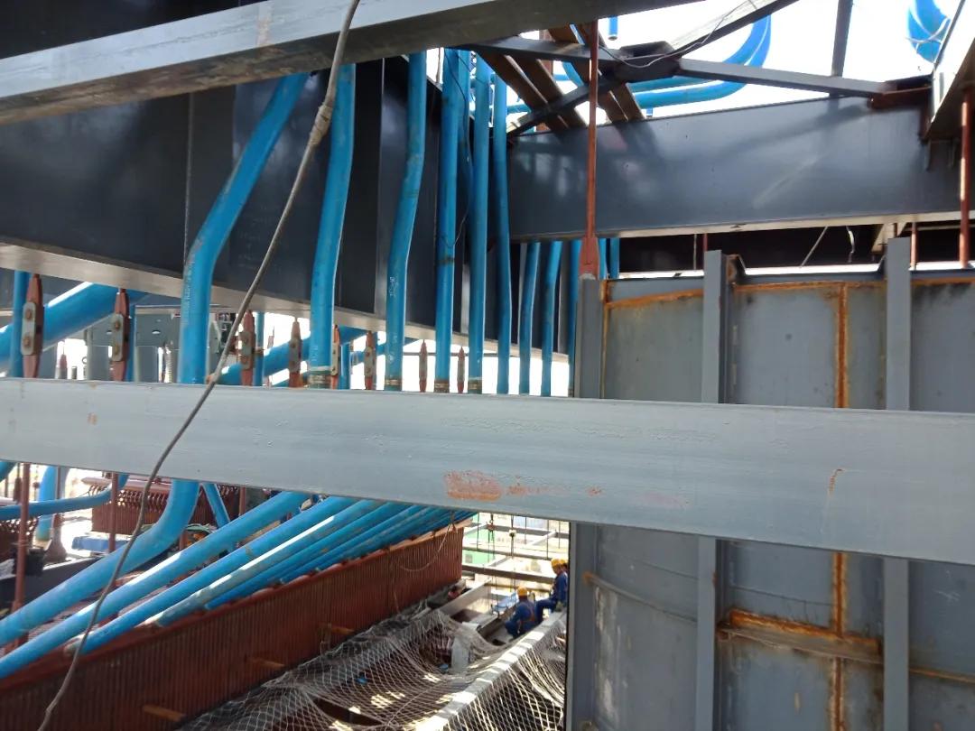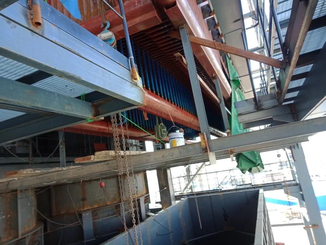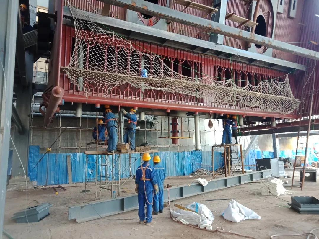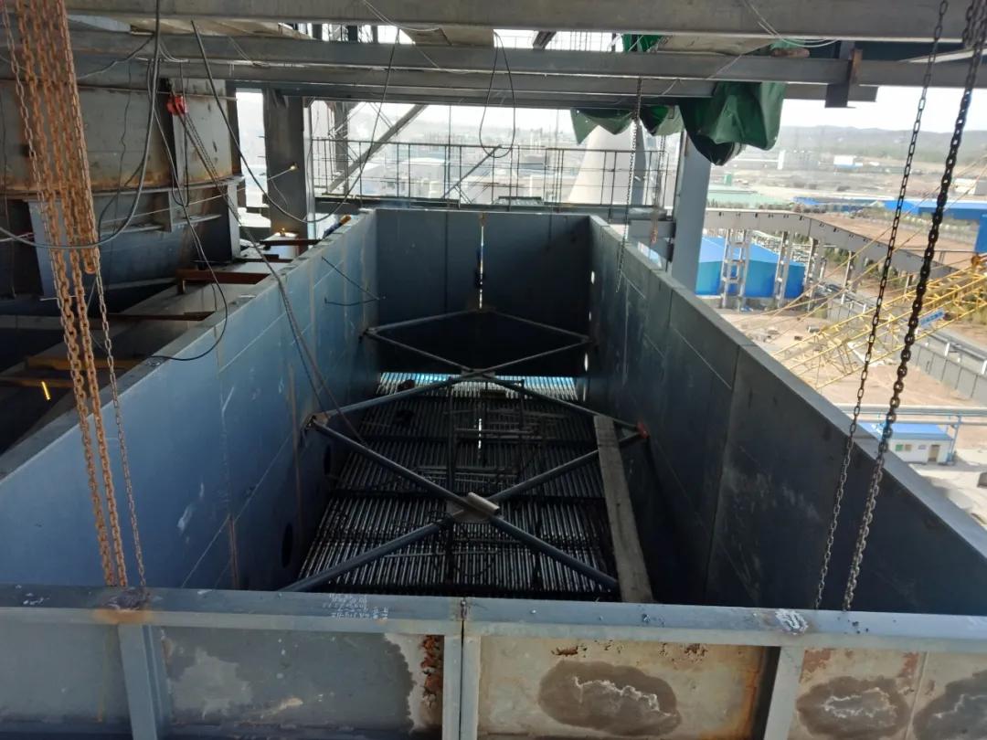 2#灰斗安装就位,吸收塔直筒最后筒体起吊组装。