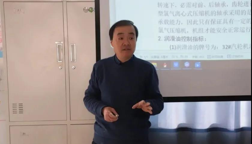培训中,徐总针对离心式氯气压缩机的系统、工作原理、使用条件;润滑油系统的功能;密封气系统操作规程;主机喘振原因、危害及预防调节措施;备用设备的保护等内容进行了详细讲解。