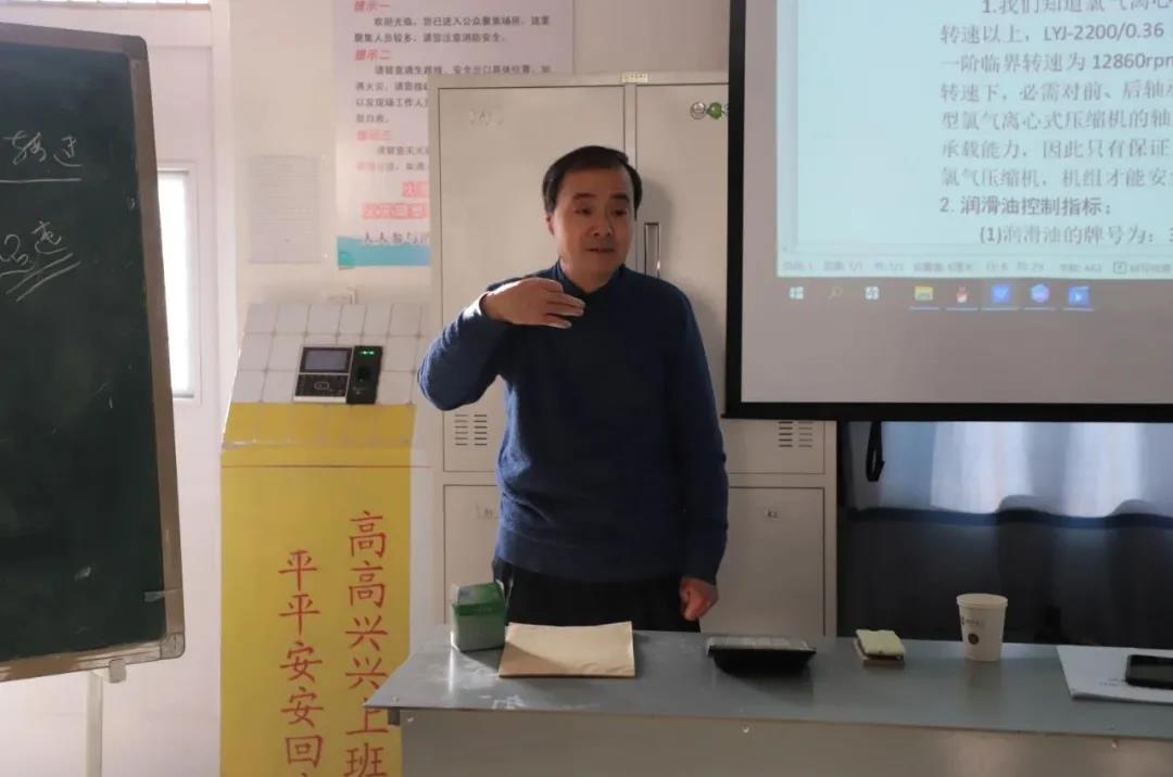 在最近的氯气压缩机学习中,我们学习到了氯气压缩机的工作原理、构造、使用条件以及润滑油的系统功能,明白了氮气对于氯气压缩机的重要性。在这次的培训中满满的“干货”,十足的接地气,通基层、贴实际。短短的一节课下来,工友们都感叹道,平时只懂如何操作氯压机,却不真正的懂他,这次的培训真是信息量大,专业知识讲解到位,与我们生产日常息息相关。是啊,在以往的培训中,更侧重生产工艺流程和操作规程的培训,这下了解了不少氯气压缩机的理论知识,再与实际操作相结合,使我们对生产出现的异常状态也能游刃有余的做出一番专业分析了。