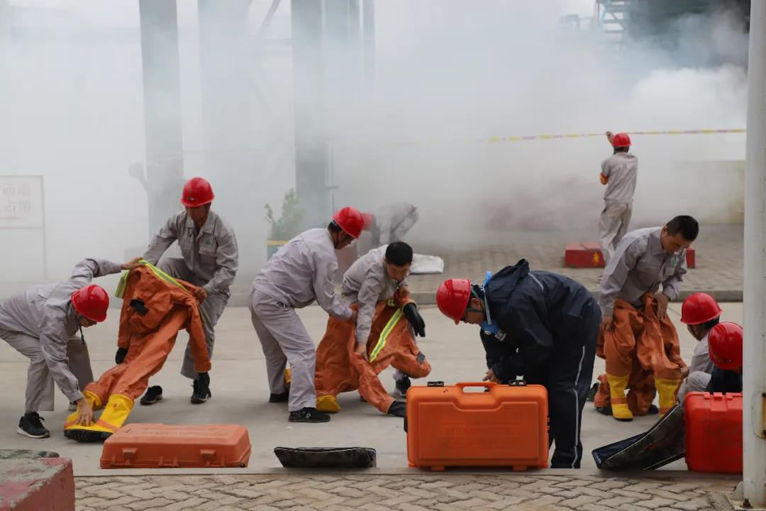 演练中,各厂领导高度重视,紧密结合生产实际,从实战出发制定了事故演练方案,精心组织安排开展预案演练。参与人员认真负责,各司其职,规范佩戴劳动防护用品,积极进行抢险救援。从事故发生、事故上报、人员疏散、安全警戒、伤员搜救、抢险抢修、环境检测等一直到善后处置均有条不紊的进行。